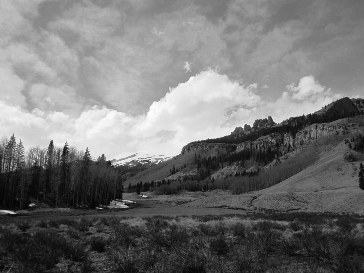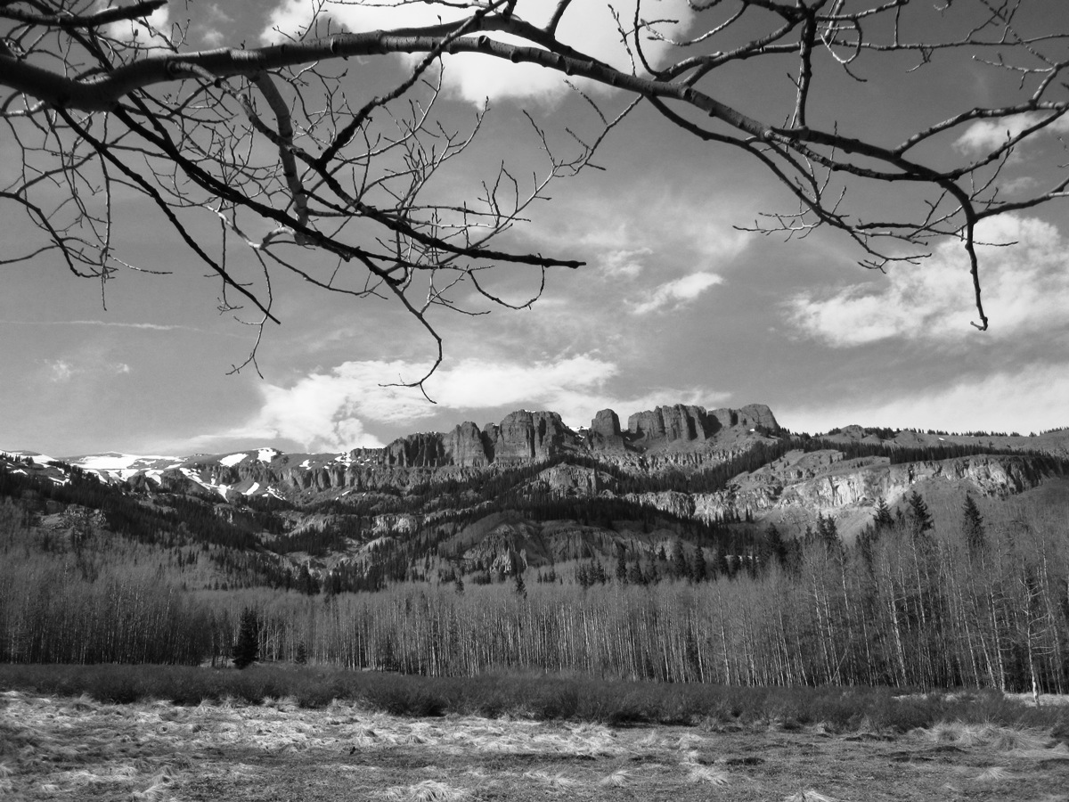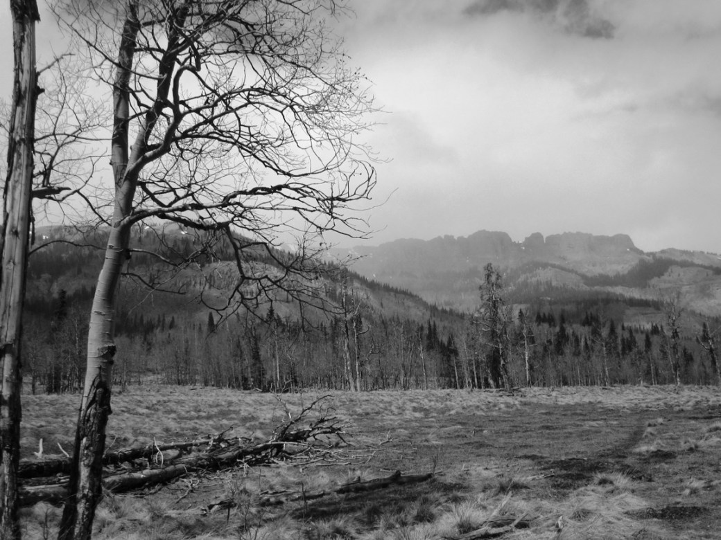 Out there miles and miles from phone, power, people.  Following a trail I have been on foot, horseback, snowshoe surely a thousand times or more. Different every time.  Now soft moist earth beneath my boots as the winter’s load is lifting and a spring storm falls on us, just me and my dog.  Only the occasional track of elk, moose or coyote crossing our path.  I see the signs well now with my head held down to reduce the resistance of the horizontal snow.  Tracks highlighted by fat white flakes on the leeward side of their impression.