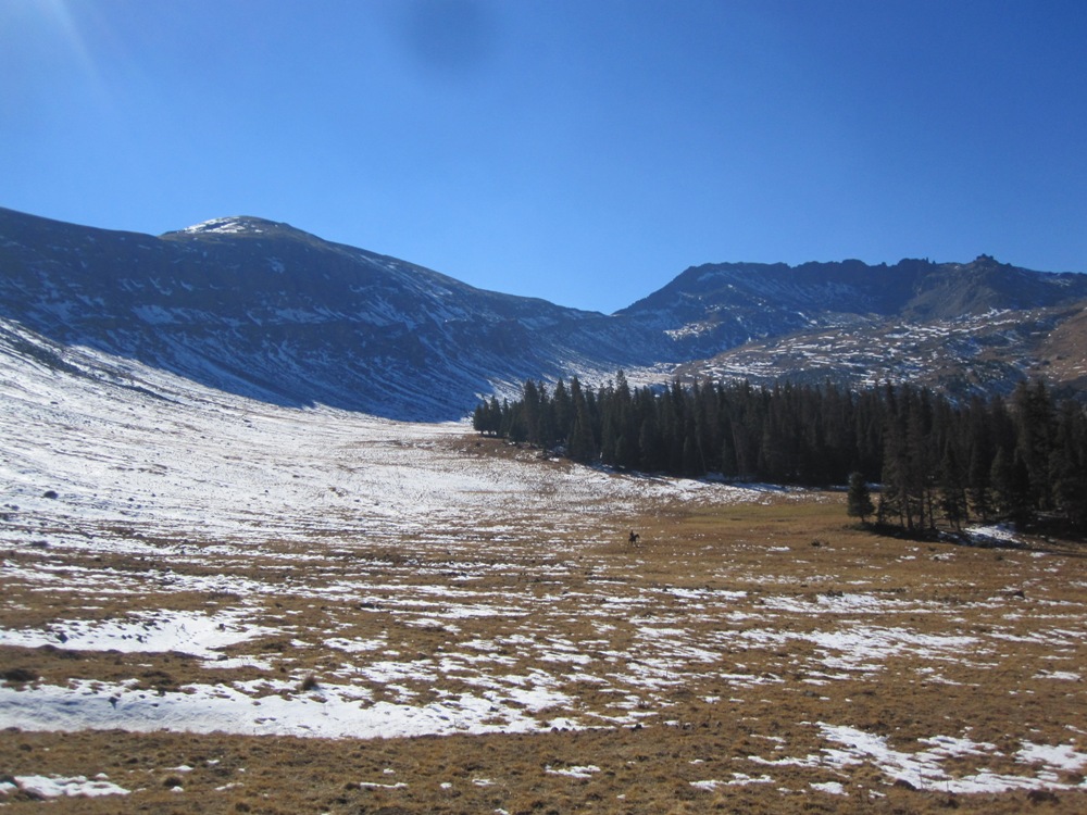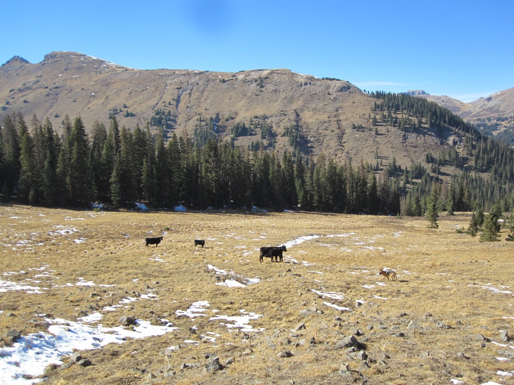 Another long day horseback while we can. This time saving the cows. A few strays from the open range herd here in summer. Somehow stuck above treeline, on frozen ground, sparse dried grass and only wind blow snow for moisture. They chose a “barn” in the last of the timber where from the tell tale signs of their manure, they planned to remain. If the hunters had not seen them, I imagine there would be nothing more than a pile of bones found there next summer. How they got there, and why they stayed, we’ll never know. I don’t read the minds of cows, and wonder in cases like this, how much to their minds there really is. Yet the depth of their understanding and appreciation after we pushed them off the mountain top down to a familiar trail (and running creek water)… I could see it in their eyes. Perhaps it is just the sympathy within me, but I swear they were loving us, and will look at a German Shepherd from here on in as their savior (for Gunnar of course was there with us, up front, moving the cows to lower ground).