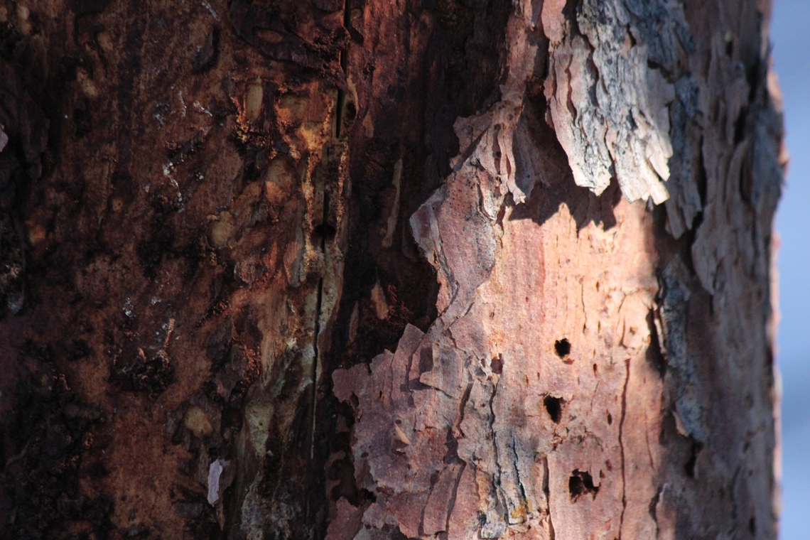 A snowshoe breaking trail along the river in among the dying trees.  Well, I guess anywhere you go here, you’ve got dying trees now.  The New Normal?  I look to find the lighter side of… death.  Where?  How?  (See, I’m asking new questions.  It’s not just Why?)