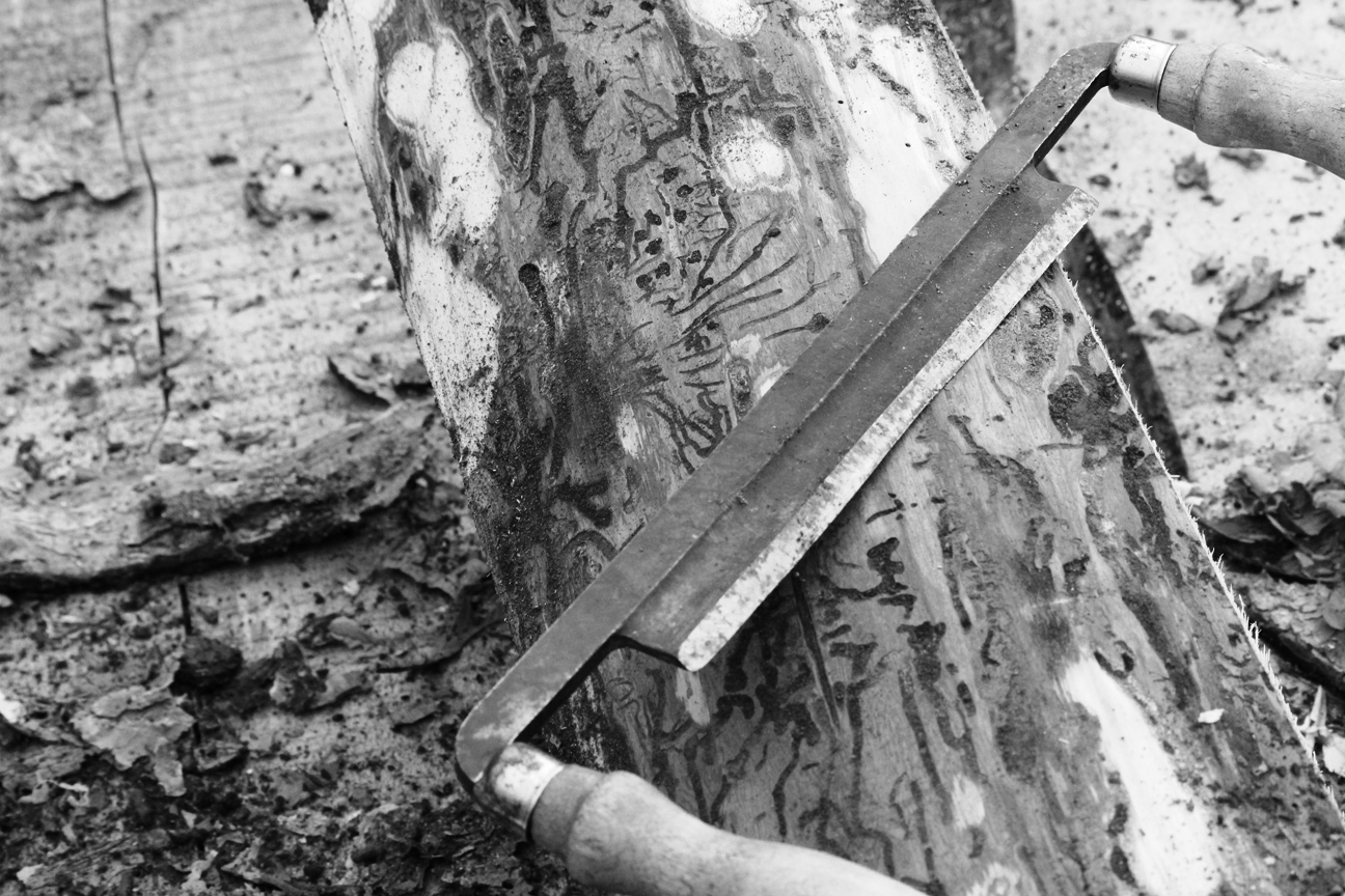In terms of construction, it’s slow but steady. Stacking big hefty logs, each one peeled and grinded, worm holes revealed, larva and young beetles removed, life and death skinned back with each pull of the blade of my drawknife, sawed and sculpted by Bob’s chainsaw, and lifted with ease by Forrest and the crane. This defines the first floor, with plenty of room for windows exposing an odd view of the changing hillside, now a silent, still wave of red trees.
