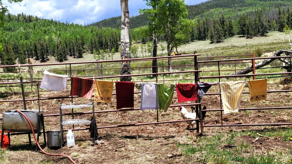Camp is set. A place to sleep and cook and clean. A road to come and go. Water to drink and a place for chickens and horses, dog and this meager thing I call a garden. A place to do laundry, store tools, wash after another dirty day.