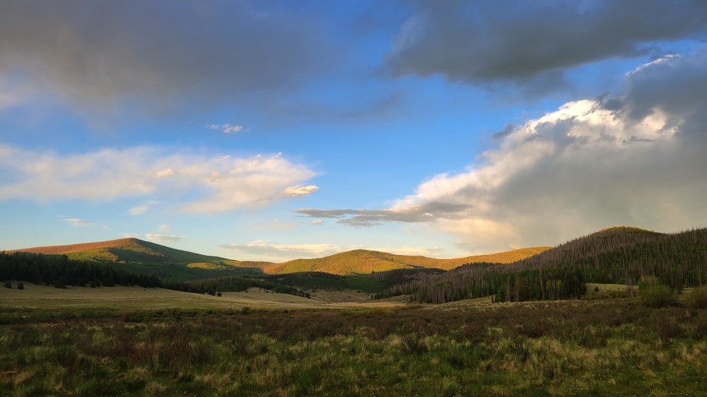 Finally a warmer evening.  No rain and hail this afternoon to cool things down to cold. So he heats a bucket of water over the fire and offers me a soak, out under the wide open sky that throws her usual evening show of colors nearly gaudy – blues and violets and magentas and grays, blending boldly in untamed air.