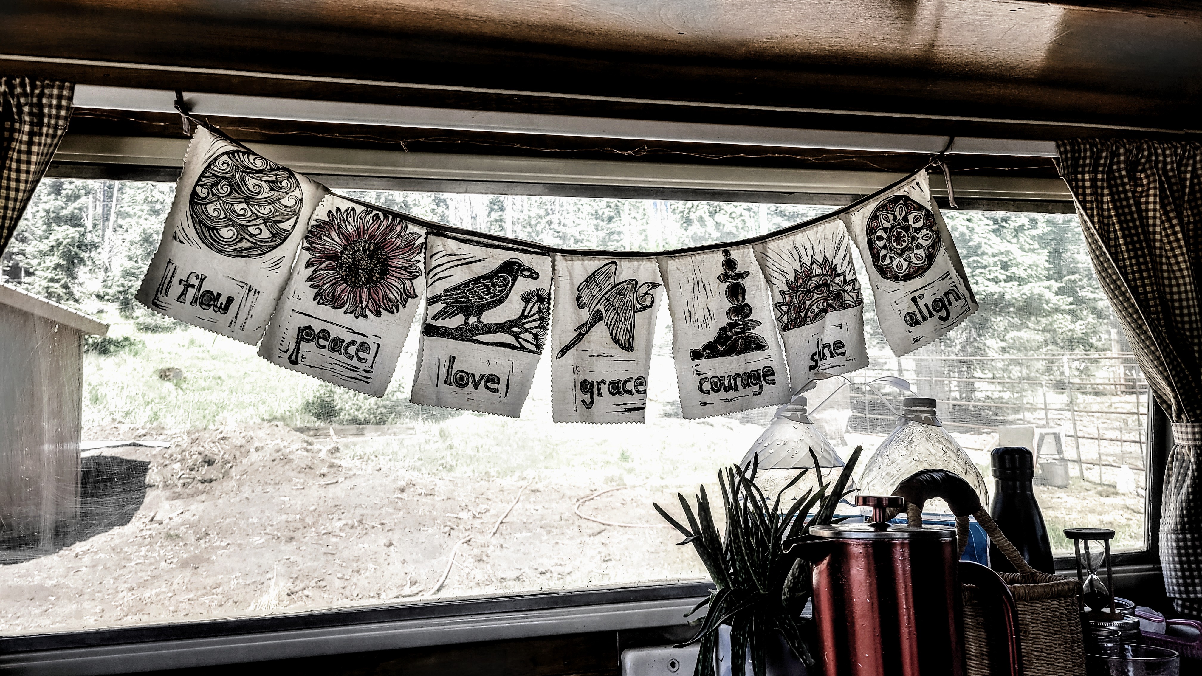 Prayer flags in the kitchen window that were custom made many years ago. The only missing message is faith. Something I am returning to. The path is unique to me. The direction is all the same.