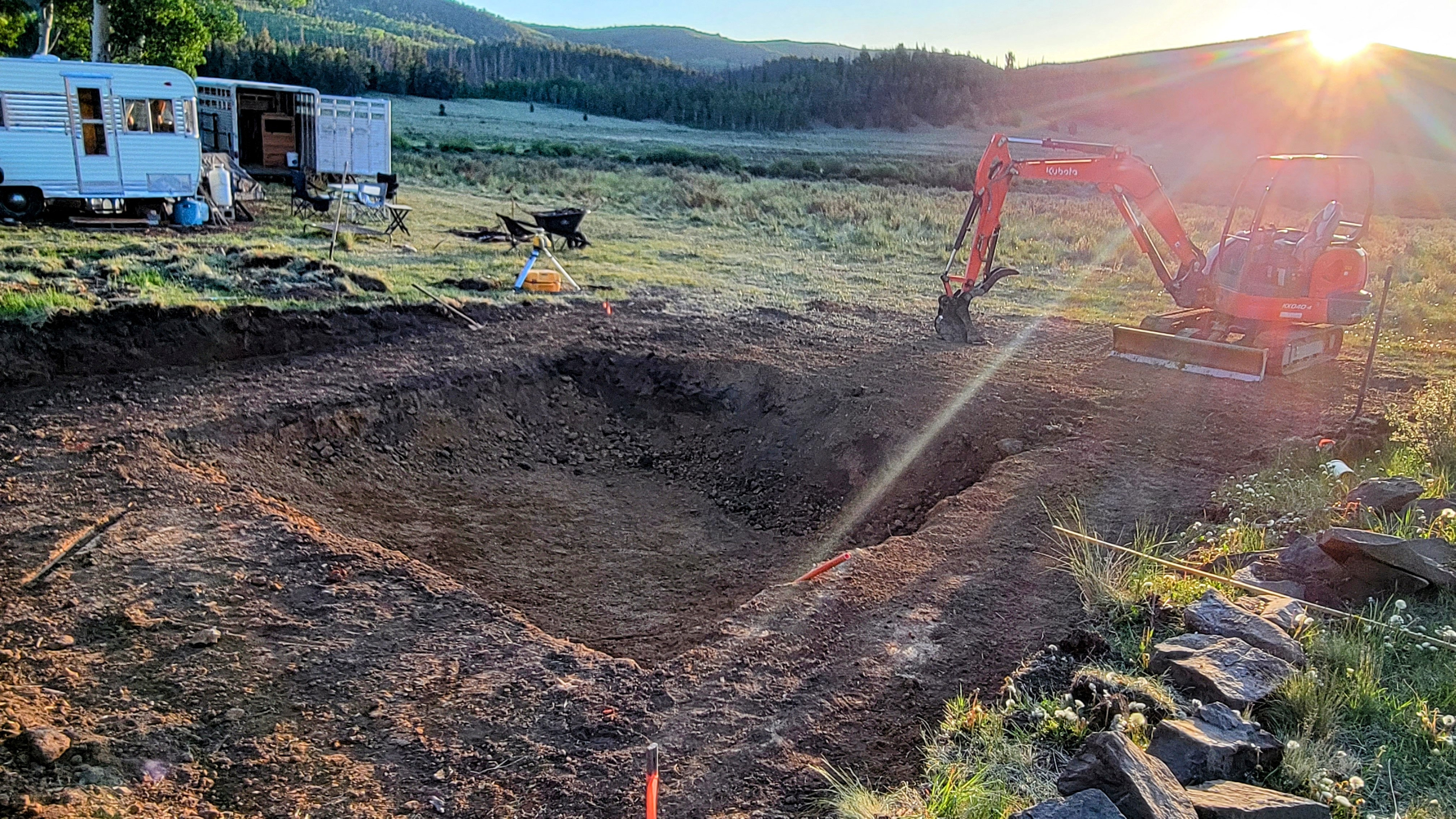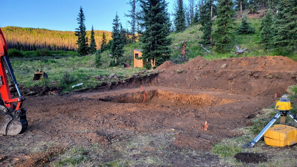 The work site stays somewhat protected against the east facing hill, tucked between the little camper and the new bathhouse. The dirt work is done. Right on schedule for a cement pour happening later this week.