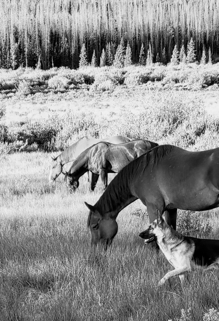 This evening, after the sun is down and shadows have dissolved for the day, we sit by the camp fire watching the pup play with marshmallows as if they were toys, little balls, flinging them around joyously as he’ll do with a dead mouse. At the cross fence line, a herd of elk move in unison up the hill and vanishes into the dark timber.