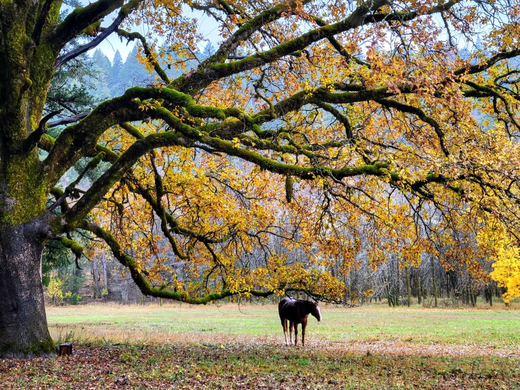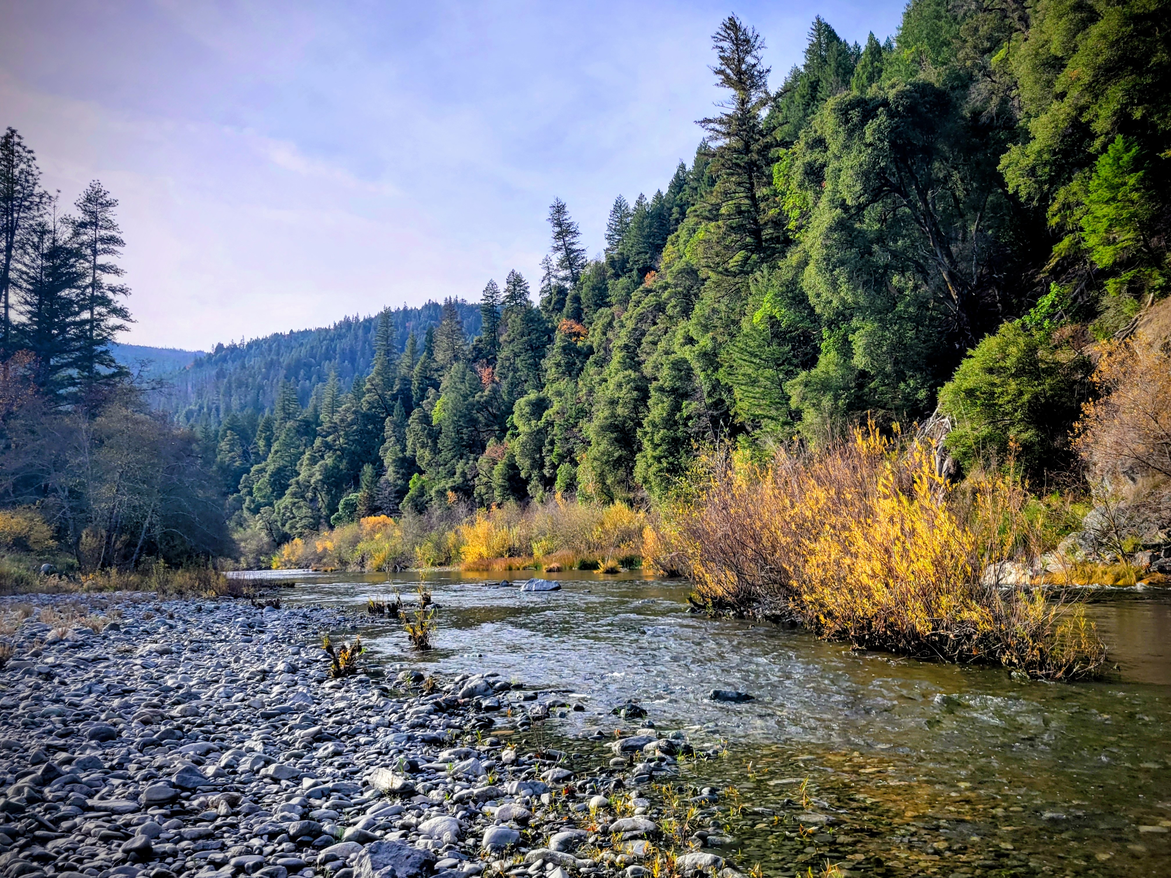 This morning I sit out in diffused sun beneath a waving veil of high clouds. Eyes closed. Lulled by the song of the river, blending high notes from flickers and phoebes, chatter from dippers and jays, and a light wind softly trembling through the last holding leaves on these ancient sprawling oaks. And ever the refrain of the river harmonizing wild and free as the blood that flows through me, inspires me, fires me, and keeps me afloat.