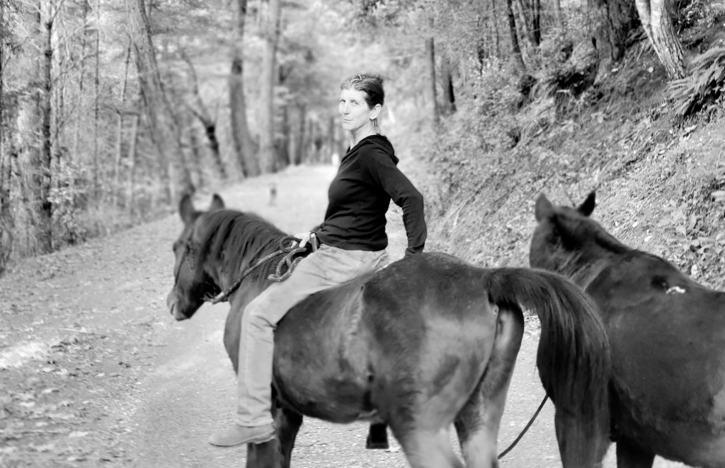 This feels like home. On the back of the horse. With my husband and dogs close by and the soft sun and leafless trees and the smell of those leaves, now grounded, brown and brittle, through which the horses walk. Today there’s no need to train or work or get somewhere or get something done, just be with the horses, the land, one another. Where we belong.