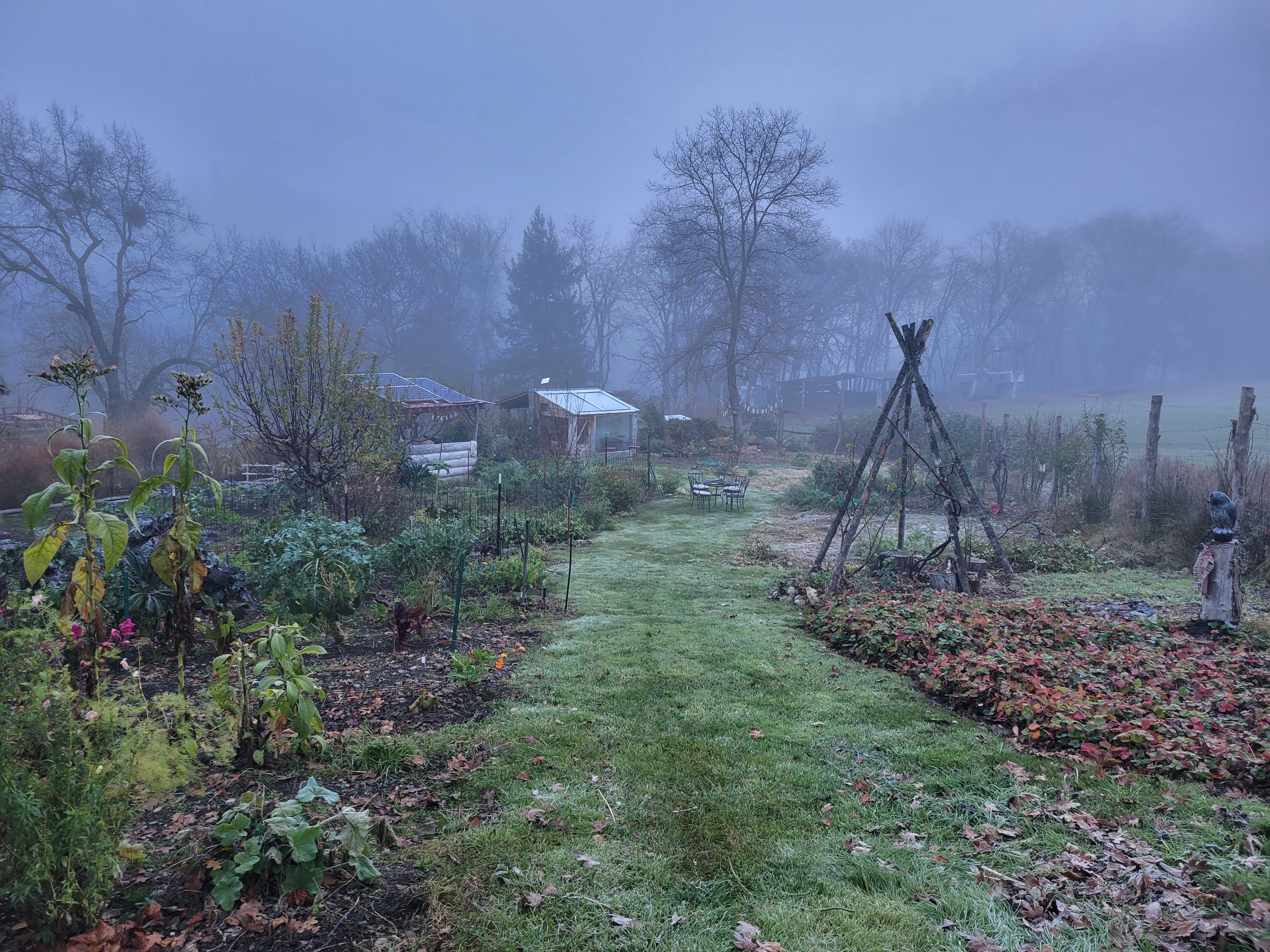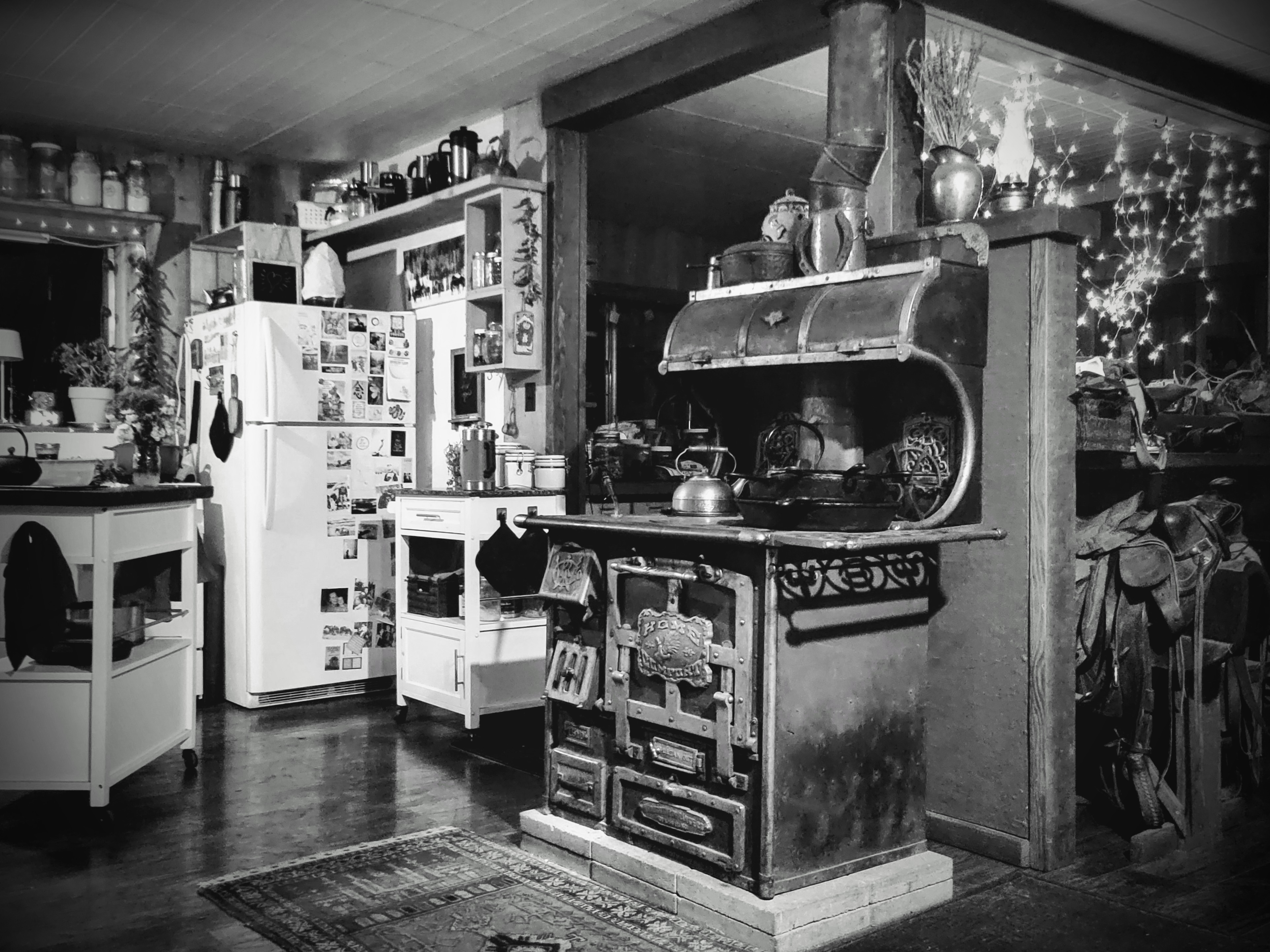 Wake in the dark. Tuck the blankets back around Bob. Pet (and step over) the still sleeping pups. Get the fire going, the coffee on, roll out the yoga mat and get down on it, stretch, meditate, light a candle to write, then as gray daylight waxes across the meadow of chalky fog, head out to let the chickens out, feed the horses, walk the dogs. Return…