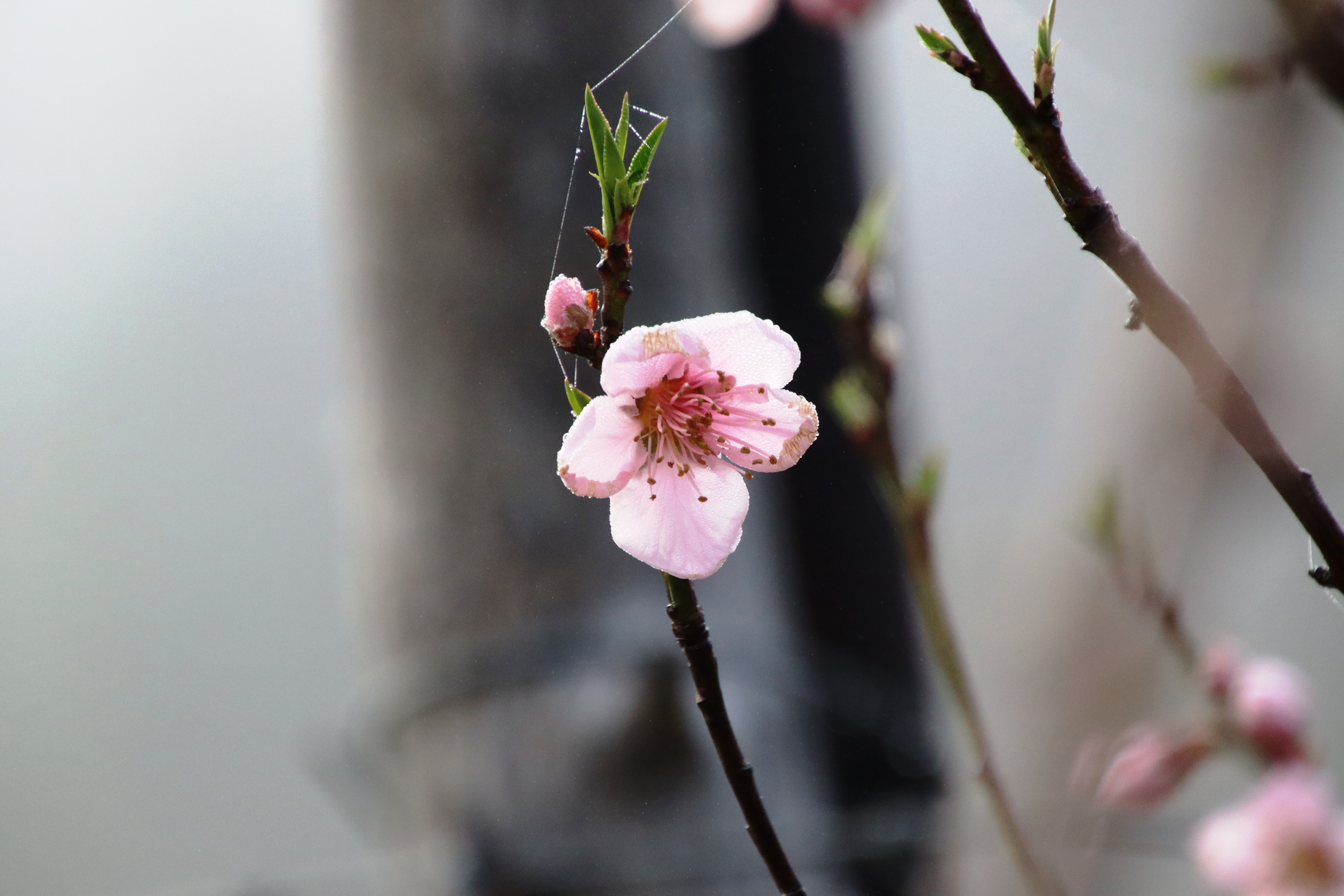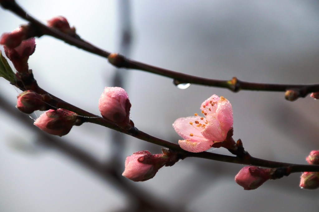 This one beginning to blossom at which the hummingbird dances in the air grew from a pit as most of my peach trees did, but not in a place that I wanted it to. It volunteered. I let it go the first year. By the second, I saw it could be a problem. It was growing under my solar panels. So I wrapped my hands around the little trunk and pulled and pulled and pulled but that tree refused to come out. Now it’s a bonsai peach tree. Big fat trunk and the top gets chopped off twice a year which doesn’t stop it from blooming profusely and producing, you know it, the best peaches ever.