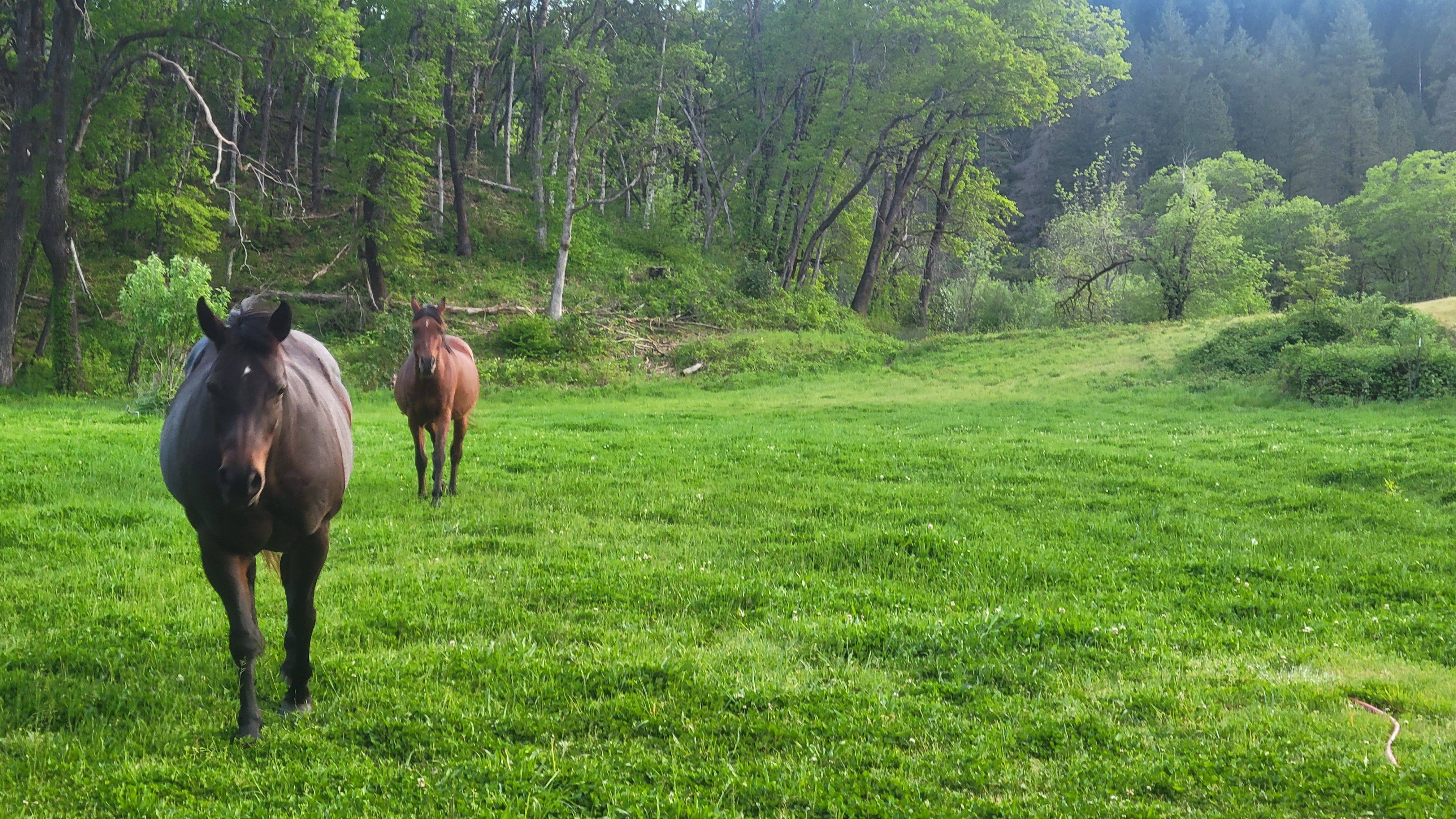Vibrant green meadows, glossy new full leaves on these ancient sprawling oaks, baby chicks hidden in the jungle that the grass is growing into, swelling fruit on peach trees. Geese and ravens, redwing and quail, and the phoebe that has nested in the eve above the picnic table every year since we’ve been here. Horses fat and sassy needing to be escorted into the barn at night because really, leaving that lush meadow is not what they choose to do. The new dog running circles around the old dog (funny since the old dog was the young one just a few years ago).