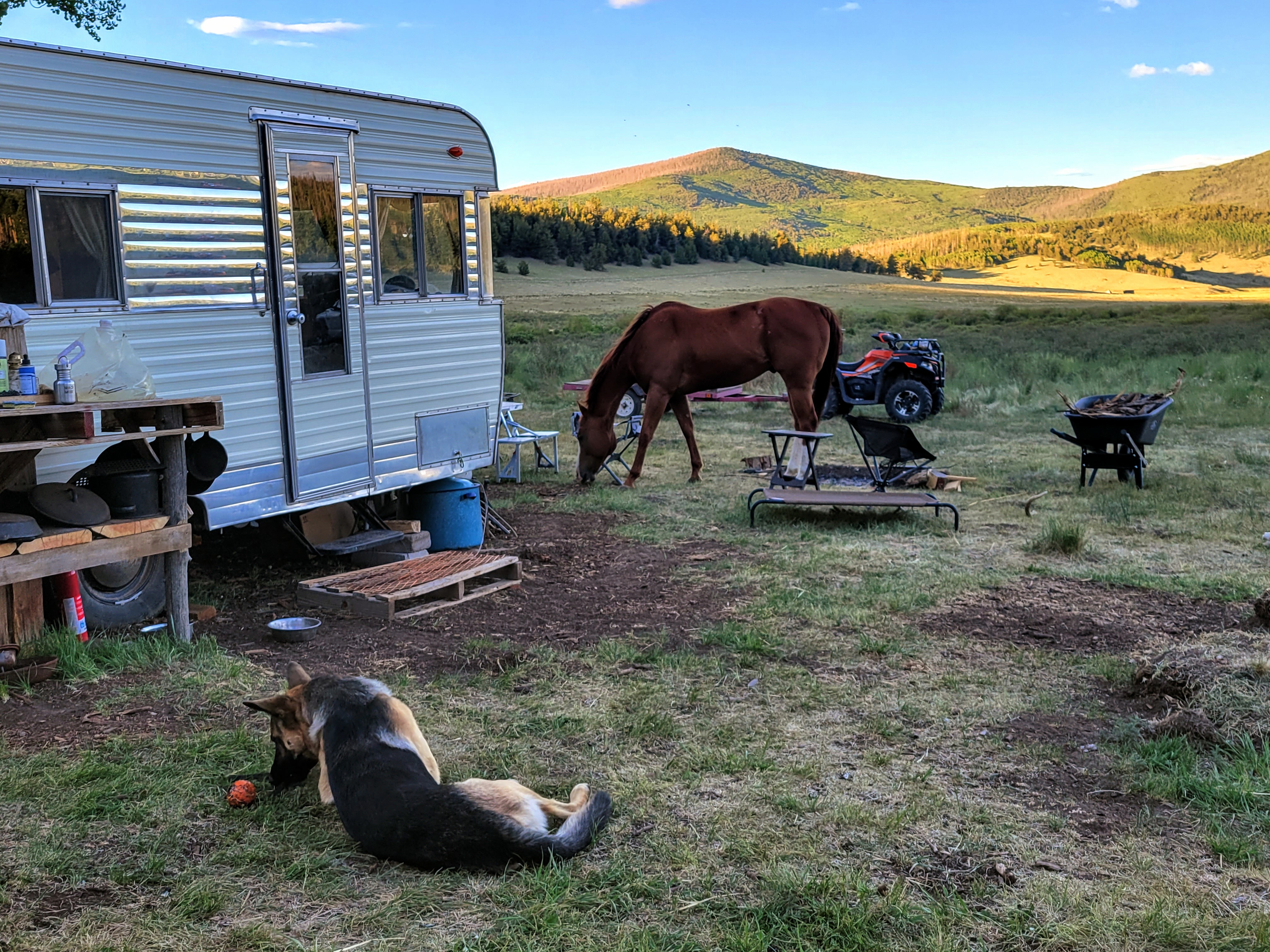 Another morning sitting at the table in this tiny trailer to write while my husband leans back in bed less than ten feet away holding his coffee cup in his hands as if in silent prayer, and the dog lays with gentle deep breathing at my feet beneath the little table that serves as kitchen and office, work space and desk, and the first of today’s sun pours in from over the hills to the east, spreading across the table like spilled milk.