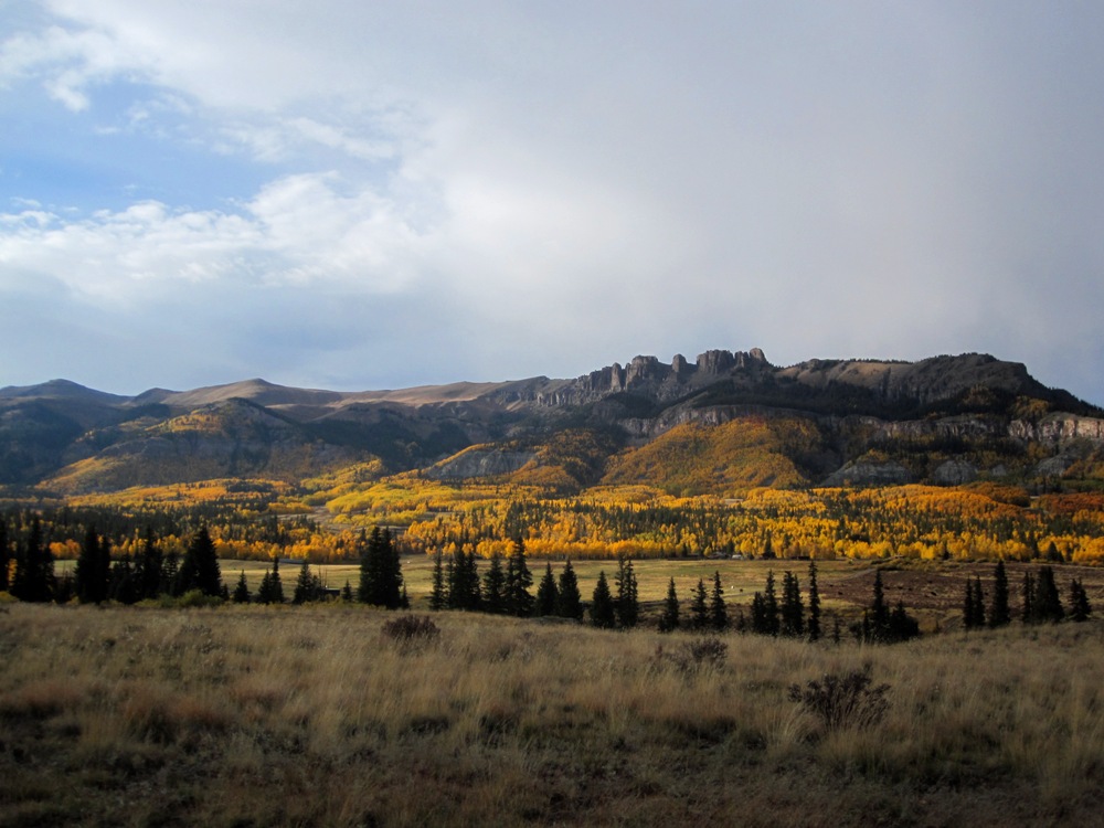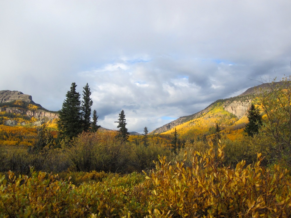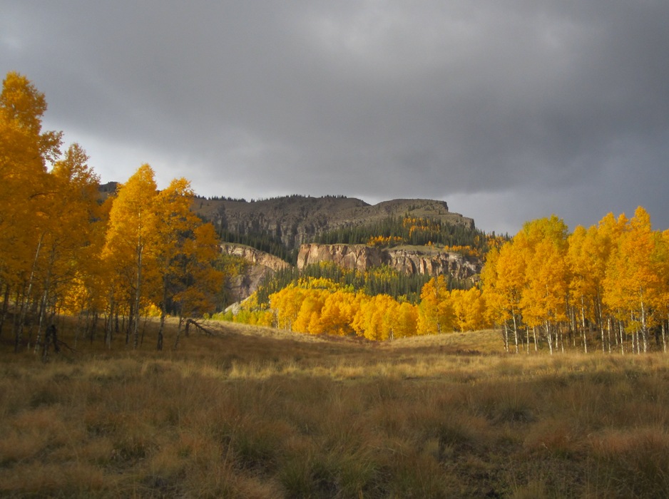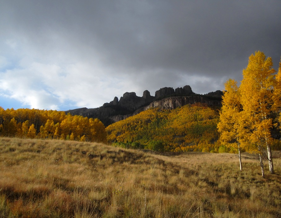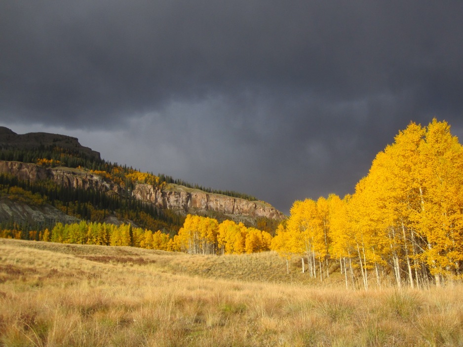 As you walk down the dirt drive to the cabin, the silence of the mountain embraces you, hills rise on all side like a visual symphony glowing in the autumn glory of turning aspen blending with the browning beetle killed trees, rising to the golden grasses of the late season high country above tree line and the sharp contrast before steel grey sky portending another storm.
