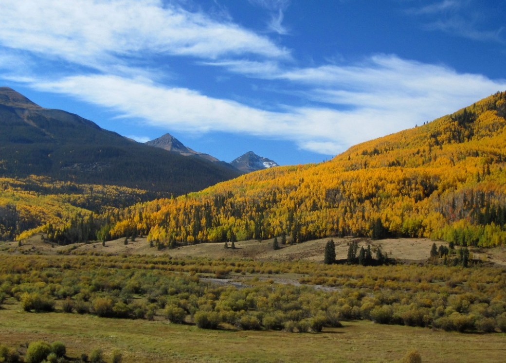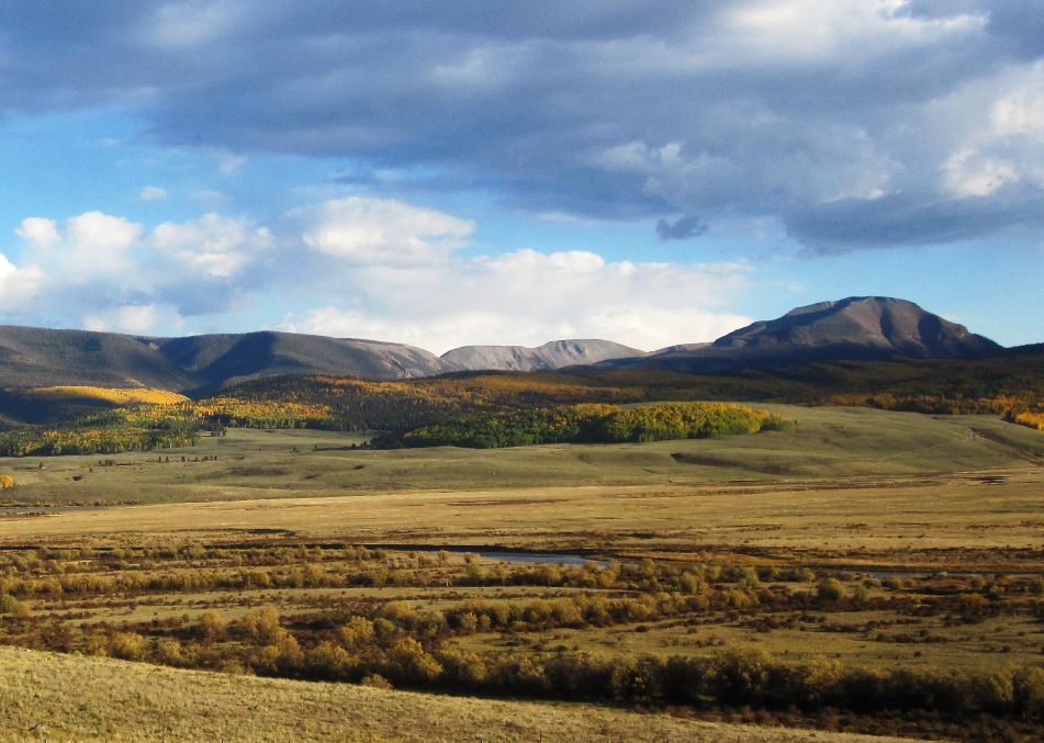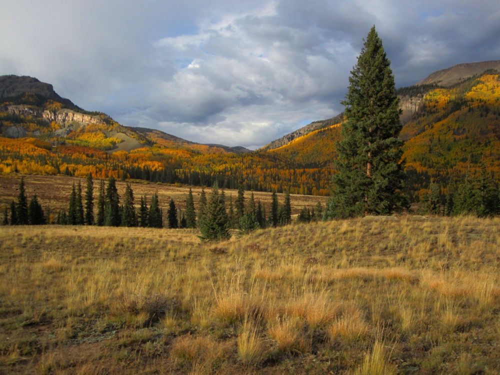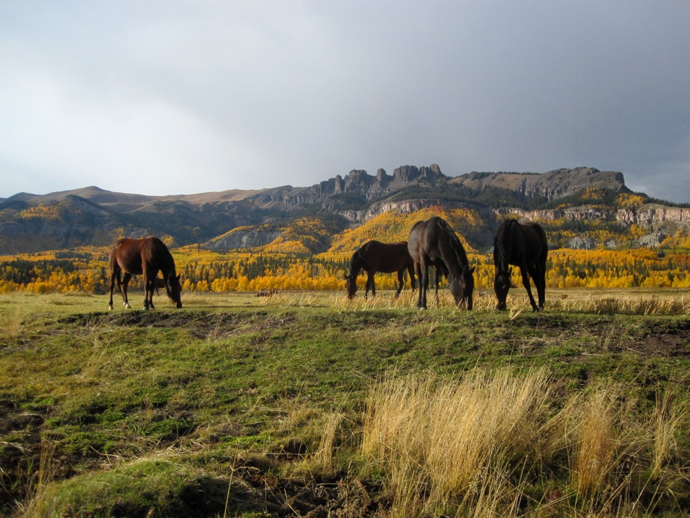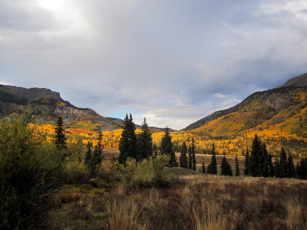 As you walk down the dirt drive to the cabin, the silence of the mountain embraces you, hills rise on all side like a visual symphony glowing in the autumn glory of turning aspen blending with the browning beetle killed trees, rising to the golden grasses of the late season high country above tree line and the sharp contrast before steel grey sky portending another storm.