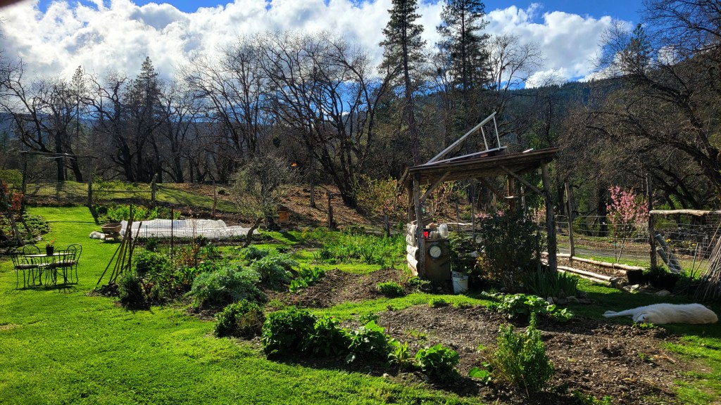 (looking back at the healthy forest surrounding our little bit of paradise – that little clearing in the center – here in the far north of California)