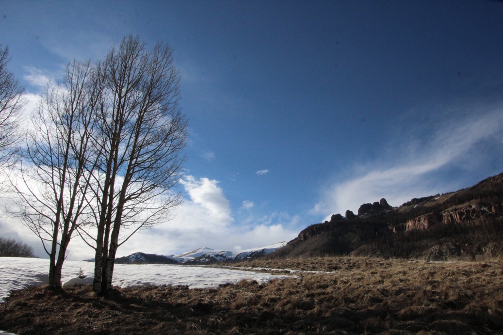Another hail storm passes through and I’m holed up in here writing to you inside what will be home for this season – a 14 foot camper circa 1964 with a pan on the little bit of floor between me and the pup, catching water that drips from the skylight, and a little counter cluttered with stuff that hasn’t yet found a place to reside for the season in the already stuffed shelves. There’s a small bed we can spoon sleep in (sometimes with the puppy as well), and a little table that will serve as kitchen, drafting table and writing desk for the season. As for plumbing, there’s a nearby outhouse, and when we finishing unpacking the trailer, a little wooden shed in which we can bath out of the cold which this place just is. As for electricity, we invested in a small portable solar system just big enough to (hopefully) keep our power tools in power, our devices operational, and provide the occational, luxurious StarLink connection. The nearest cell phone service is down the dirt road a good fifteen miles or so, but that’s nothing new for us.