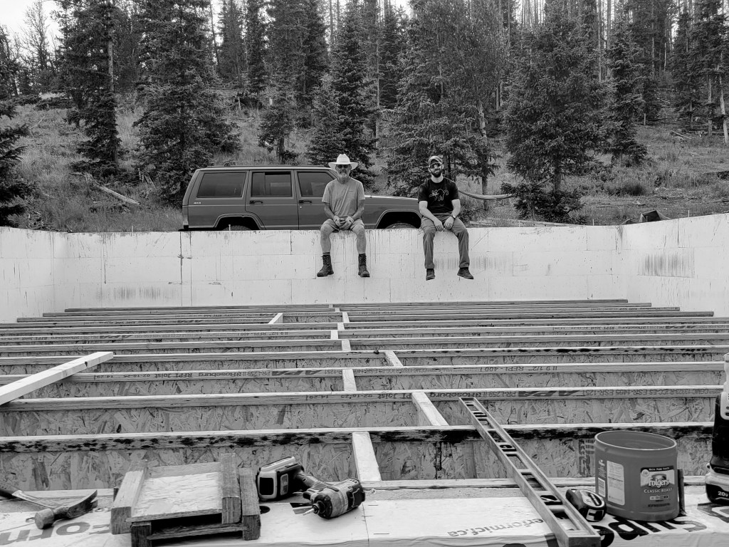 As for progress and updates and the latest news from up on this high, wild land, well, our son was as usual a huge help getting our floor joists lined out (Thank you, Forrest!!!!!) and Bob and I got the plywood down (see the celebration dance below).